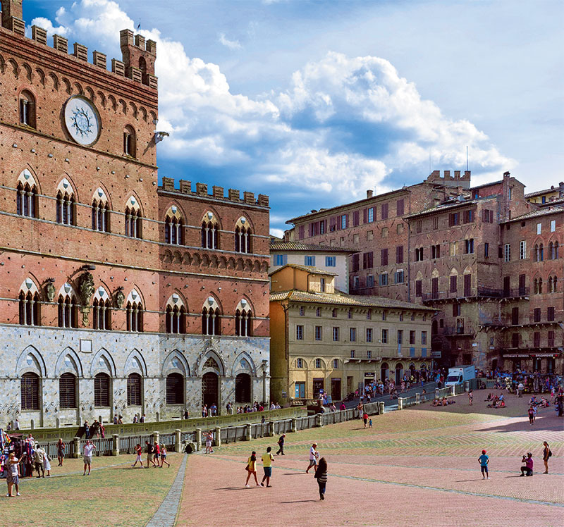 Ярко выраженным центром старой Сиены служит главная городская площадь – пьяцца дель Кампо. Расположенная ниже соседних с ней участков, она похожа на воронку, куда словно стекают вовлекаемые в вихреобразное движение соседние кварталы. Площадь имеет в плане необычную веерообразную форму, напоминающую античный театр. Жители же города традиционно усматривают в этой форме напоминание о плаще Девы Марии – небесной заступницы Сиены. Вымощенная камнем разных оттенков, Кампо разделена полосами травертина на девять секторов в память о том времени, когда городом правил Совет девяти. Разграничительные линии радиусами расходятся от здания ратуши – палаццо Публико. Возведенное в 1297–1310 годах (крылья были надстроены в конце XVII века), это здание, подобно родственным ему по назначению сооружениям, с которыми мы уже успели познакомиться, своим мужественным обликом должно было олицетворять характер свободолюбивого города, никогда не жалевшего сил и жертв в борьбе за независимость.