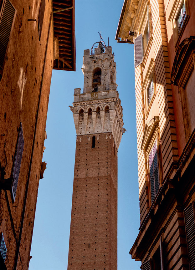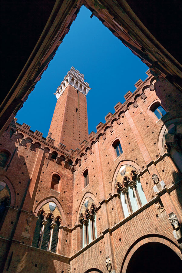 Действительно, во внешних формах палаццо Публико мы снова легко можем усмотреть сходство с архитектурой укрепленных замков или крепостей: непроницаемый массив кирпичной кладки стен и зубчатые парапеты подтверждают эту аналогию самым недвусмысленным образом. Однако так же, как и в других подобных примерах, суровость внешнего вида ратуши до известной степени нивелируется за счет размещения на фасаде тройных арочных окон, вполне способных принять на себя роль изящных украшений. Композицию палаццо Публико дополняет колоссальная башня – Торре дель Манджа, возведенная как часть ратуши в 1338–1348 годах братьями Франческо и Муччо ди Ринальдо из Ареццо. Ее высота достигает 102 метров, так что башня способна выполнять в силуэте города функцию доминанты, заметной с очень больших расстояний. В том, чтобы служить «маяком», указывающим путь к городу тем, кто спешил в него с добрыми намерениями, а в необходимых случаях тревожным набатом своих колоколов собирать горожан для отпора врагам, и заключалось основное предназначение башни. С этой вполне серьезной ролью как-то не очень вяжется ее полушутливое название, в переводе на русский язык означающее «обжора»; скорее всего, в таком названии содержится напоминание о далеко не малых средствах, поглощенных башней во время строительства. Высокий призматический «столп» Торре дель Манджа эффектно выглядит в различных ракурсах, в том числе и со стороны узкой, как ущелье, виа Ринальди – одной из многочисленных и очень живописных улиц средневековой Сиены. С кирпичным телом башни контрастирует ее белокаменная «корона» – венчание в виде бельведера-звонницы, основанием которому служит венец машикулей, еще раз напоминающих (как и зубцы) о родстве этого характерного сооружения с фортификационным зодчеством.
