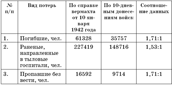 В-шестых, сведения 10-дневных донесений войск о потерях вступают в вопиющее противоречие со свидетельствами немецких участников войны. Так, по данным 10-дневных донесений войск с 11 октября по 10 декабря 1941 года группа армий «Центр» потеряла погибшими, ранеными и пропавшими без вести 93430 чел., что составляет чуть более 5 % от численности войск перед началом операции «Тайфун» (1800 тыс. чел.), а бывший начальник штаба 4-й немецкой армии генерал Гюнтер Блюментрит в статье о Московской битве (сборник «Роковые решения») сообщает, что к середине ноября 1941 года: «…В большинстве пехотных рот (штатная численность пехотной роты – 150 чел. – В.Л.) численность личного состава достигала всего 60–70 человек…», т. е. численность немецких пехотных подразделений сократилась более чем на 50 %. В разговоре по телефону 30 декабря 1941 года с Гитлером командующий 4-й немецкой армии генерал-фельдмаршал Гюнтер фон Клюге сообщил фюреру, что «…войска как физически, так и духовно утомлены, а случаев обморожения значительно больше, чем указывается в ежедневных сводках штаба группы армий…». Пауль Карелл в книге «Восточный фронт. Книга первая. Гитлер идет на Восток. 1941–1943» сообщает, что с 9 октября по 5 декабря 1941 года 40-й моторизованный корпус вермахта потерял около 40 % от номинальной боевой численности, что в процентном отношении в 8 раз больше, чем потери группы армий «Центр», отраженные в 10-дневных донесениях войск. Командующий группы армий «Центр» генерал-фельдмаршал Федор фон Бок в начале декабря 1941 года записал в своем дневнике «…сила немецких дивизий в результате непрерывных боев и наступившей суровой зимы уменьшилась более чем наполовину: боеспособность танковых войск стала и того меньше…». Эти свидетельства говорят о том, что в реальности потери вермахта в Московской оборонительной операции были в несколько раз выше сведений о потерях, содержащихся в 10-дневных донесениях войск.