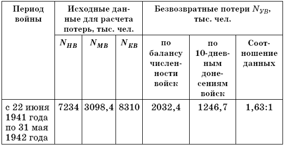 Потери по 10-дневным донесениям войск и по балансу численности вермахта с 22 июня 1941 года по 31 мая 1942 года приведены в табл. 1.4. Численности вермахта по годам войны заимствованы из таблицы, приведенной на странице 330 книги генерал-майора вермахта Буркхарта Мюллера-Гиллебранда «Сухопутная армия Германии. 1939–1945», т. 3. Буркхарт Мюллер-Гиллебранд не указывает даты, на которые подсчитаны численности вермахта, но сравнивая численности действующей армии, приведенные в таблицах на страницах 82 и 330 его книги, можно предположить, что численности вермахта в таблице на странице 330 даны на середину соответствующего года. Численность мобилизованных в вермахт взята из таблицы, приведенной на странице 329 труда Б. Мюллера-Гиллебранда.