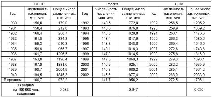 Обратимся к современности. В табл. 2.2. приведены данные о численности заключенных и населения в СССР в 30-х годах, а также в России и США в 90-х годах ХХ века.