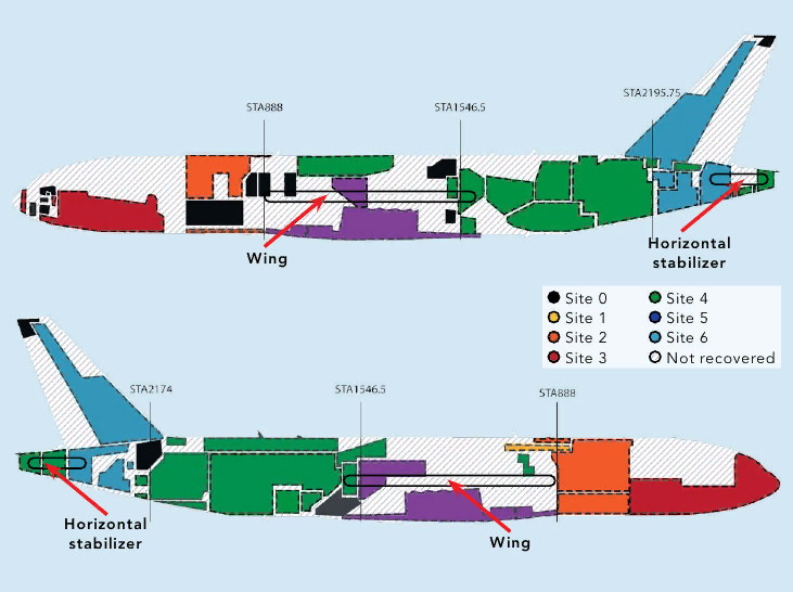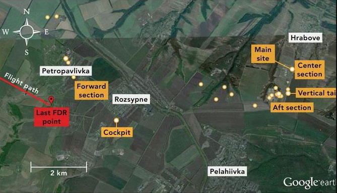 В соответствии с этими расчётами первая тяжёлая часть Боинга, ассоциируемая с багажным отделом, упавшая в районе Петропавловки, отделилась от лайнера в примерно 13:19:29 вблизи населённого пункта Орлово-Ивановка. Примерно через 20 с от самолёта отделилась кабина пилотов. Остальная часть Боинга упала вблизи села Грабово примерно через 87 с, что, очевидно, свидетельствует о работе двигателей самолёта в течение первых 43 с (из 87), тянувших оставшуюся часть самолёта около 5,5 км.