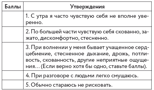 Для облегчения попробуйте вспомнить 5 или 10 ситуаций или случаев, о которых идет речь в утверждении, и определить, сколько раз из 5 или 10 ваше поведение (самочувствие) соответствовало утверждению. Например: из 10 разговоров с людьми в среднем в 5 я испытываю смущение; из 10 дел в 3 рискую; за десяток ночей раз‑другой может присниться кошмар…