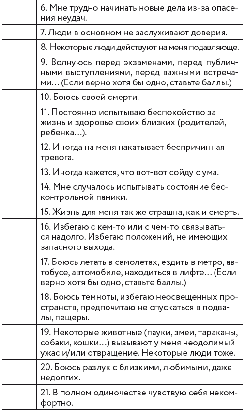 И это же – зеркало для вашей самооценки: поглядевшись в него, вы сможете определить у себя и общее «количество» страха (с. 13–17), и его уровень в той или иной жизненной сфере, в конкретной направленности (с. 18–20). Учитывается при этом, что есть страхи осознаваемые и есть неосознаваемые.