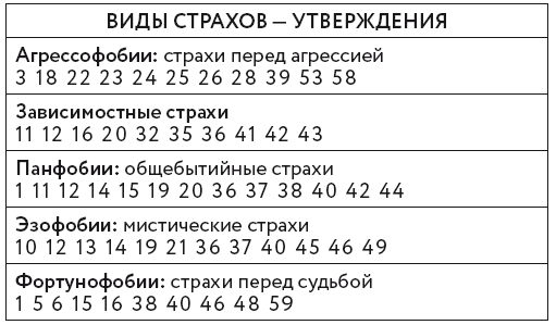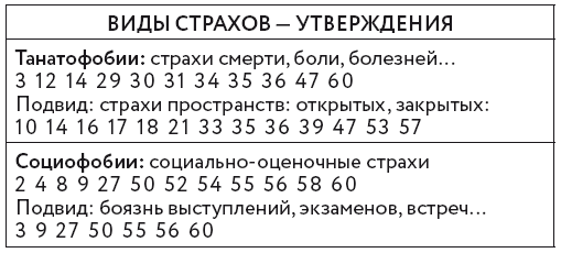 По своим результатам С‑теста вы можете определить их с учетом, что одни утверждения относятся к одним видам страхов, другие к другим, а некоторые ко многим.