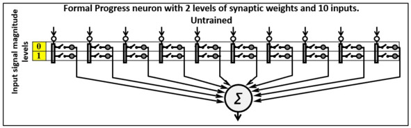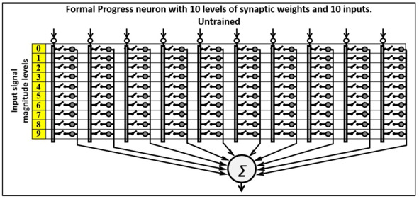 The training of the Progress neuron to a specific image boils down to the distributor determining the signal level (in the simplest case, its amplitude or RGB value) and closing the switch corresponding to the range of weights in which this value falls.