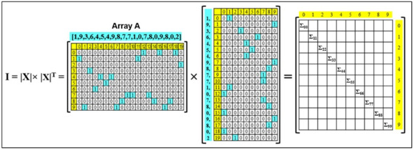 for X ≠ A, f (A) A is a given value. N is the dimension of vector X, the number of digits in this vector. This format, called the Binary Comparison Format (BCF), is a rectangular binary digital matrix in which: • The number of columns is equal to the length N (the number of digits) of the array. • The number of rows equals the number of weight levels K selected for the network. • Each significant digit is denoted by one (1) in the corresponding line, and the absence of a digit is denoted by zero (0). • Each string corresponds to some significant digit of the numeric array to be written, i.e., in a string marked as “zero,” the digit “1” corresponds to the digit “0” in the original array, and in a string marked as “ninth,” the digit “1” corresponds to the digit 9 in the array. • In each column of the matrix, one unit corresponds to the value of this figure, and all other values in this column are equal to 0. • The sum of all units in the array matrix is equal to the length N of the array; for example, for an array of 20 digits, it is 20. • The total number of zeros and ones in the matrix of each array is equal to the product of the length N of this array and the value of the base of the number system used. Example: BCF notation of an array of 20 decimal digits [1, 9, 3, 6, 4, 5, 4, 9, 8, 7, 7, 1, 0, 7, 8, 0, 9, 8, 0,2]. Fig. 6. BCF image as a sparse binary matrix A feature of the PANN network is that the image training of neurons typical of neural networks can be replaced by reformatting files that carry numerical dependencies to the BCF format or simply loading files in this format to the network. Type X arrays in BCF format are denoted as matrices |X|. 2.4.2. Comparing Numeric Arrays Comparing objects or determining similarities and differences Determining the similarity of particular objects by comparing them plays an enormous role in thinking, making it possible to identify analogies and differences between different objects – beings, objects, processes, ideas, etc. In various branches of science, primarily in the Theory of Similarity, dimensionless similarity coefficients or similarity criteria (Similarity Coefficient or CoS) are used, sometimes called the “measure of similarity,” the “measure of association,” and so on. Comparison functions in PANN are implemented through mathematical operations on matrices of numeric arrays. Let’s consider the most straightforward comparison algorithm, which uses the vector product of image neuron matrices. Two arrays are given for comparison in the form of matrices |X1| and |X2|. |X1| × |X2|T is the vector product of the matrix |X1| on a transposed matrix |X2|. Moreover, the value of this product is proportional to the number of units in |X1| and |X2|. |X1| × |X2|T = N only if |X1| = |X2|; |X1| × |X2|T |X1| × |X2|T = 0 if none of the pixels of these matrices match. Consider the relationship: Here, the CoS (Similarity Coefficient) between the numerical vectors X1 and X2 determines the degree of closeness of these vectors and the images described by these vectors. Examples: Fig. 7. Multiplying matrices to compare numerical arrays Fig. 8. Comparison of decimal numerical arrays |A| and |B| Classical neural networks only determine which class a recognizable object is most similar to. At the same time, they cannot specify how similar it is. Because of this, recognition is sometimes unstable – there are well-known examples where a change in a pixel in an image was enough to change its recognition. Thus, recognition in classical networks is highly dependent on random noise. In PANN, the situation is different – the similarity coefficient value very clearly shows how significant the difference between the images is. A similarity difference of one hundredth in the format of 32 × 32 pixels corresponds to a change of about 10 pixels. And this is already enough to distinguish the images from each other confidently. The one-tenth difference indicates a profound difference and high recognition stability – low dependence of recognition on noise. In contrast to classical neural networks, PANN networks allow you to improve the quality of recognition dramatically by: • Statistical processing of recognition by classes and by images. • Combining class-based recognition and image-based recognition. Moreover, combined recognition by classes and images allows us to solve one of the most unpleasant problems that limit the use of neural networks in medicine and many other applications – the problem of transparency and explainability of the network results. We will discuss this in l in the “4.6. Recognition on the PANN Network” section. 2.4.3. Assessment of the validity and accuracy of recognition The validity and accuracy of image recognition by neural networks are essential for their use. The accuracy and reliability of recognition of a classical neural network are determined by testing several dozens, hundreds, or thousands of images and counting the number of correct and incorrect recognitions. This test is very controversial. Due to the opacity of classical networks, recognition is highly dependent on random training features: • Sometimes, training outcomes are poorly reproduced; the same network trained on the same images will recognize better in some cases than worse in others. • There are no ways to assess each image’s accuracy and recognition reliability adequately. • Impact of test image selection. Sometimes, they are selected specifically to ensure the desired result. Recognition by PANN networks is evaluated by the numerical similarity coefficient of the image under consideration: 1. With any set of individual images loaded to the network. 2. With all classes that this network is trained in. At the same time, both classes and individual images are ranked according to the degree of similarity, which allows for an accurate assessment of the magnitude of the differences between all the comp