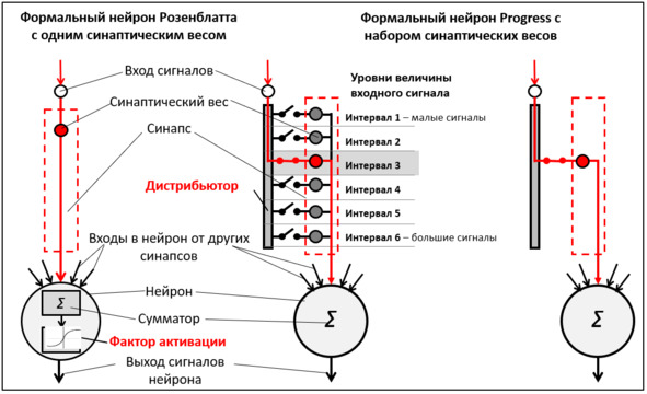 Формальный нейрон Розенблатта имеет один синаптический вес. Главным отличием PANN является формальный нейрон Progress с двумя или более синаптическими весами на каждом синапсе.