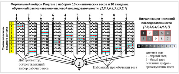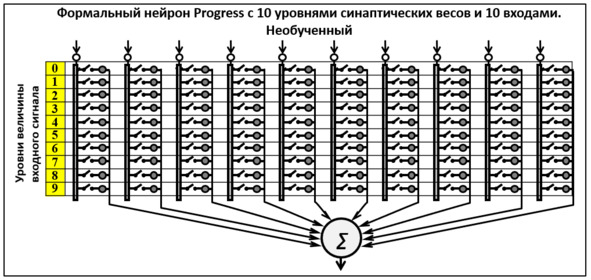 Обучение нейрона Progress некоторому образу сводится к тому, что дистрибьютор определяет уровень сигнала (в простейшем случае его амплитуду или величину по шкале RGB) и замыкает выключатель, соответствующий интервалу весов, в который попадает данная величина.