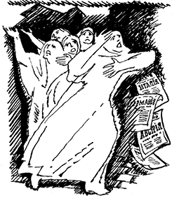 Мрачные до черного вышли люди,тяжко и чинно выстроились в городе,будто сейчас набираться будетхмурых монахов черный орден.Траур воронов, выкаймленный под окна,небо, в бурю крашенное, –все было так подобрано и подогнано,что волей-неволей ждалось страшное.Тогда разверзлась, кряхтя и нехотя,пыльного воздуха сухая охра,вылез из воздуха и начал ехатьтихий катафалк чудовищных похорон.Встревоженная о́жила глаз масса,гору взоров в гроб бросили.Вдруг из гроба прыснула гримаса,после –крик: «Хоронят умерший смех!» –из тысячегрудого мехагремел омиллионенный множеством эхза гробом, который ехал.И тотчас же отчаяннейшего плача ноживрезались, заставив ничего не понимать.Вот за гробом, в плаче, старуха-жизнь, –усопшего смеха седая мать.К кому же, к кому вернуться назад ей?Смотрите: в лысине – тот –это большой, носатыйплачет армянский анекдот.Еще не забылось, как выкривил рот он,а за ним ободранная, куцая,визжа, бежала остро́та.Куда – если умер – уткнуться ей?Уже до неба плачей глыба.Но еще,еще откуда-то плачики –это целые полчища улыбочек и улыбокломали в горе хрупкие пальчики.И вот сквозь строй их, смокших в одинсплошной изрыдавшийся Гаршин{16},вышел ужас – вперед пойти –весь в похоронном марше.Размокло лицо, стало – кашица,смятая морщинками на выхмуренном лбу,а если кто смеется – кажется,что ему разодрали губу.1915Мое к этому отношение
