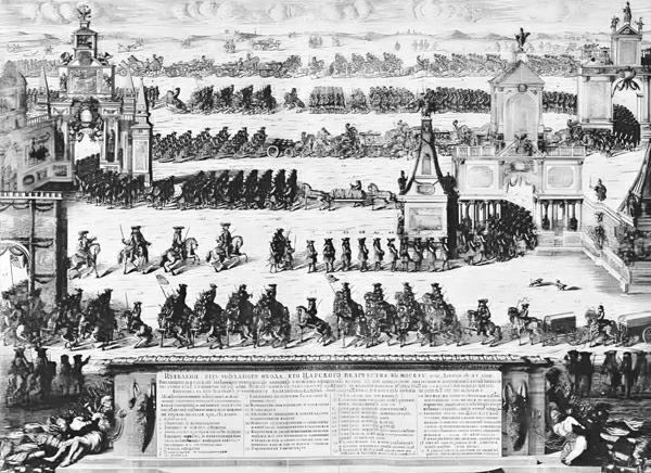 А. Ф. Зубов. Торжественное вступление русских войск в Москву после Полтавской победы 21 декабря 1709 года. 1711. Гравюра