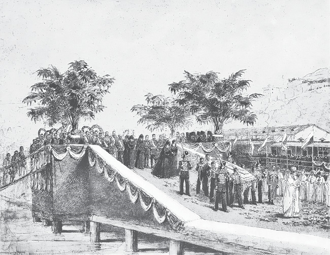 Конвойцы медленно приблизились к паперти церкви и передали драгоценную ношу на руки Государя Императора, наследника Цесаревича, Принца Вельсского, Великих Князей и генерал-адъютантов, которые внесли гроб в церковь и уставили на катафалк. Маленькая церковь могла вместить только незначительную часть участвовавших в печальной процессии, и потому, после того как вошли в церковь Высочайшие Особы и лица свиты, двери были закрыты для публики на время служения панихиды. Когда, по окончании панихиды, Августейшие Особы простились с дорогим усопшим и в каретах возвратились во Дворец, двери церкви были открыты для всех желавших поклониться праху усопшего Монарха.