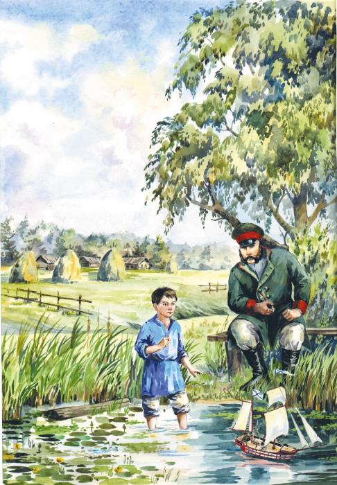 А однажды Павлуша начал сам, своими руками, мастерить полностью оснащённый парусник. Сидел он над ним долго, работал терпеливо и, доведя дело до конца, повёл отца к пруду показать, как его кораблик, движимый лёгким ветром, шустро пересекает водную гладь от берега до берега.