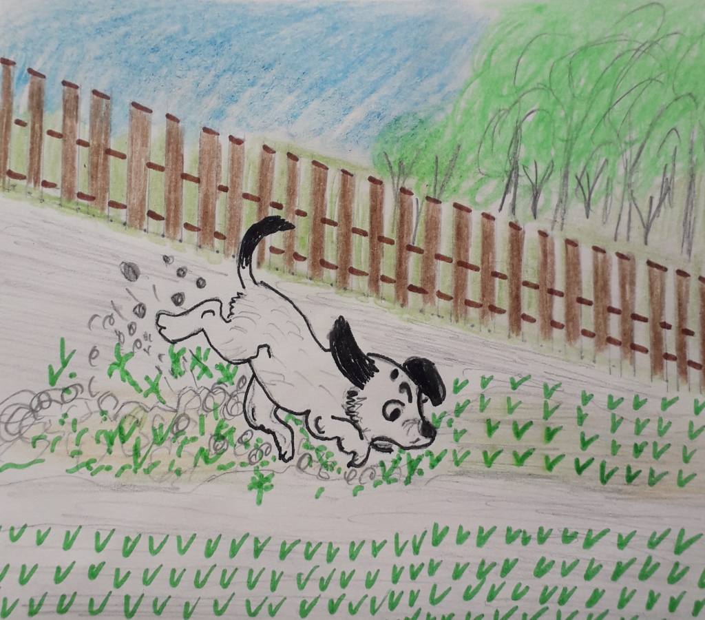 Щенку показалось это забавным, он продолжил своё занятие. Значок уже успел перекопать половину грядки, когда его увидела бабушка. Она начала ругать щенка и выгнала его с огорода. С этого дня калитку в огород бабушка всегда закрывала. Щенок теперь гулял только во дворе.