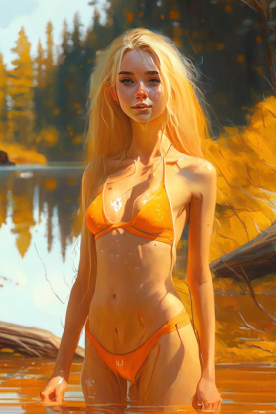 А дальше происходит то, что я уже наблюдал в течение полутора месяцев. Сначала девушка демонстрирует фигуру в оранжевом купальнике, производит эффект, но я только сдержанно улыбаюсь. Не смущаясь, полностью разоблачается, не оборачиваясь ко мне, элегантно, как ей кажется, лифчик и трусики на травку, потягивается, подходит к воде и осторожно трогает ножкой воду.