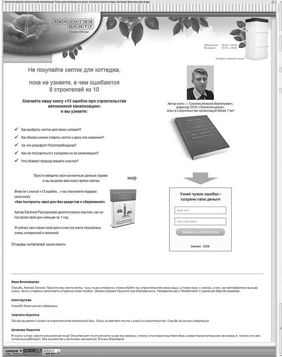 Если бы я не знал об успехах этой компании, я бы никогда не стал приводить эту страничку захвата в качестве примера. «Экология-центр» занимается продажей автономных канализаций для коттеджей по всей России. На своей страничке захвата они активно предлагают скачать бесплатную книгу «13 ошибок при строительстве автономной канализации». Человек, оставивший свои контакты, получает книгу, несколько полезных статей и приглашение на онлайн-семинар, где «Экология-центр» совершает свои продажи.