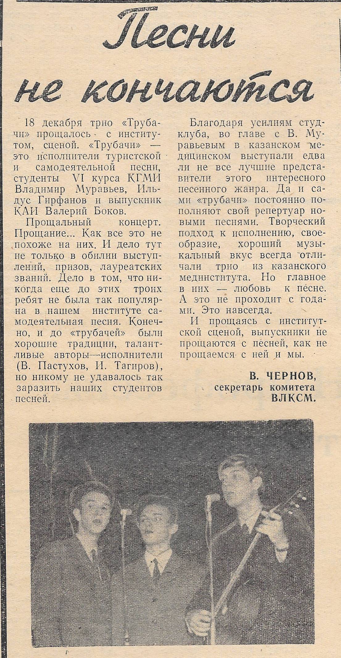 18 декабря трио «Трубачи» прощалось с институтом, сценой. «Трубачи» – это исполнители туристской и самодеятельной песни, студенты 6 курса КГМИ Владимир Муравьев, Ильдус Гирфанов и выпускник КАИ Валерий Боков.