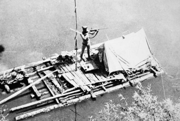 Шел проливной холодный дождь. Мы вылавливали в реке редкие бревна, оставшиеся от весеннего сплава, крепили их привезенными с собой металлическими скобами и к вечеру, дрожа от холода, соорудили вполне приличное плавсредство. На нем был настил из досок, палатка, рулевое весло, мачта, а на корме – место для разведения костра и приготовления пищи.