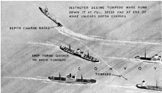 Порядок действий корабля эскорта конвоя во время атаки последнего подлодкой. Субмарина выпускает торпеду – атакуемое судно уклоняется от торпеды, заметив ее след, эсминец следует по следу торпеды к месту ее пуска подлодкой и сбрасывает там серию глубинных бомб. (http://ibiblio.org)
