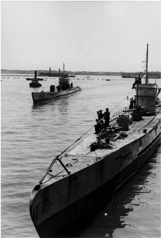 «Девятки» в гавани Лориана. На переднем плане U-107, на заднем плане U-159. В описании фото на сайте Бундесархива допущена ошибка. Это фото не могло быть сделано 12 июля 1942 года, так как U-107 вернулась из похода 11 июля, а U-159 – 13 июля. Поэтому, вероятнее всего, снимок мог быть сделан 13 июля 1942 года, когда обе лодки уже были в Лориане. (https://www.bild.bundesarchiv.de)