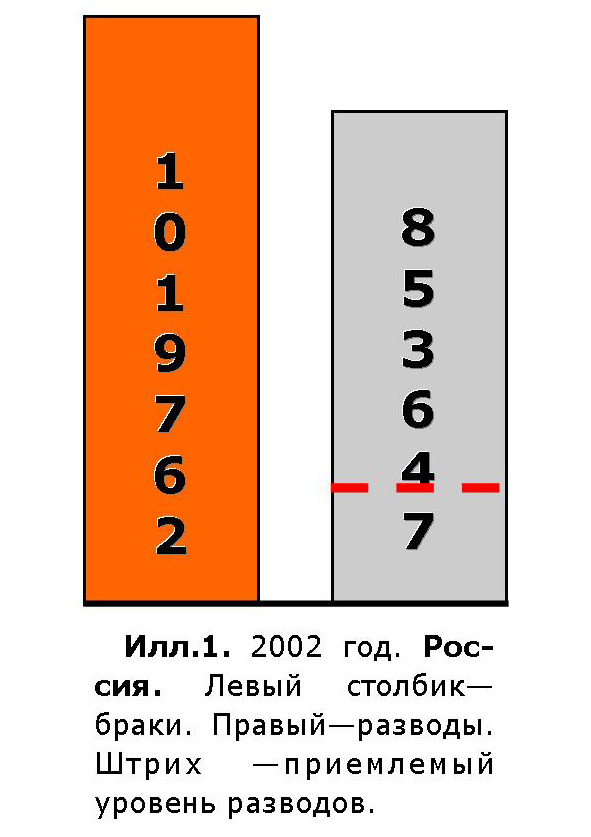 , советский учёный Илья ШЕВЕЛЕВВ 2002 году в постсоветской России случилось самое большое количество разводов —853.647. ВОСЕМЬСОТ С ПОЛОВИНОЙ ТЫСЯЧ с «копейками». Заметим – официальных разводов, т.е. тех, что зарегистрированы в государственных органах записи гражданских состояний (ЗАГС). А сколько распалось неофициальных браков?