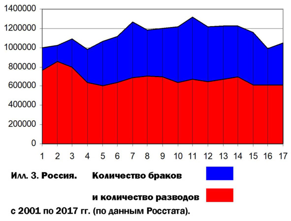 Это значит, что семьсот-восемьсот тысяч детей остались без полноценного воспитания, а два-три миллиона наших сограждан получили сильнейший удар по психике (не забудем, что и родители разведённых пар тоже психически пострадали).