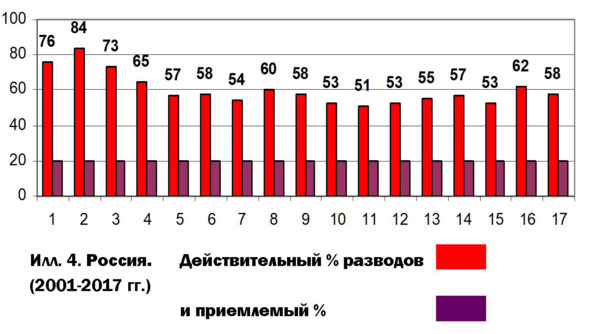 Между тем, приемлемый процент разводов в обществе – максимально 20%.