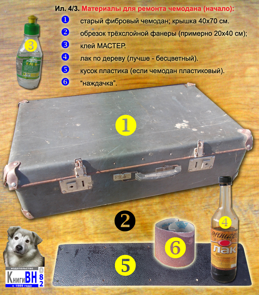 1. Для ремонта чемодана XXI века нам потребуется старый советский чемодан 60-х, 70-х годов. А именно – фибра, из которой он сделан. Размер чемодана 40х70 см. Нам достаточно будет крышки чемодана-ветерана. Возможно, пригодится и ручка: ручки для советских чемоданов делали из хорошего прочного пластика.