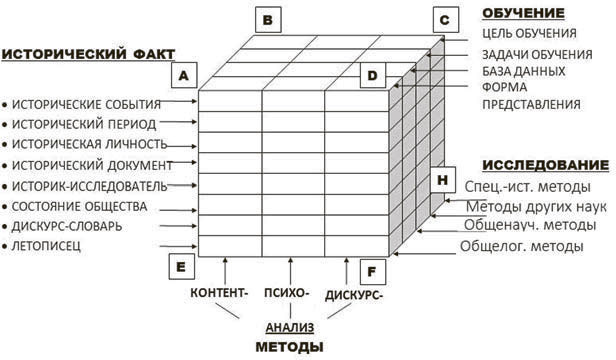 Модели (см. рис. 2—4), разработанные с участием И. Г. Орешко, раскрывают взаимодействие декларативного и процедурного знания на базовом уровне когнитивных процессов проявления личности в истории. Используя модель куба, Н. И. Миницкий представил объемную