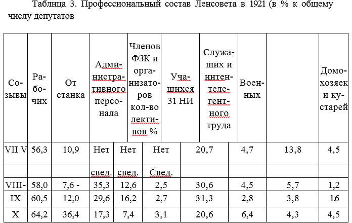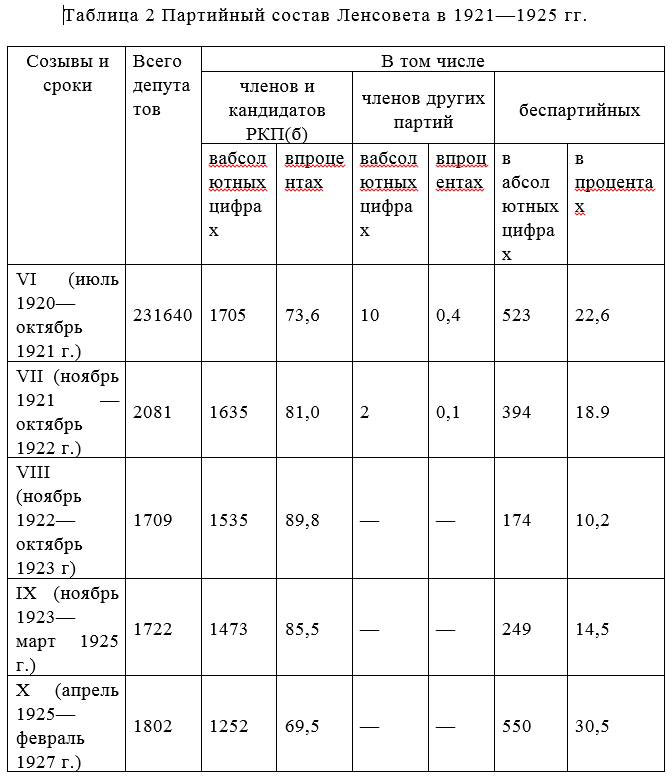 Из приведенной таблицы видно, что в годы восстановительного периода соотношение беспартийных и коммунистов в Совете было 1:4. Однако вопрос о связи коммунистов с массами, о привлечении широких слоев, трудящихся к государственному строительству оставался весьма актуальным. Если учесть, что на производстве в 1921—1923 гг. было занято всего 20—25% состава петроградской парторганизации, а в Совете было очень мало рабочих от станка, то это соотношение надо признать недостаточным. Особенно мало беспартийных было в составе Совета VIII созыва – всего 10,2%. В составе Совета X созыва количество беспартийных депутатов значительно увеличивается и достигает 30,5%.