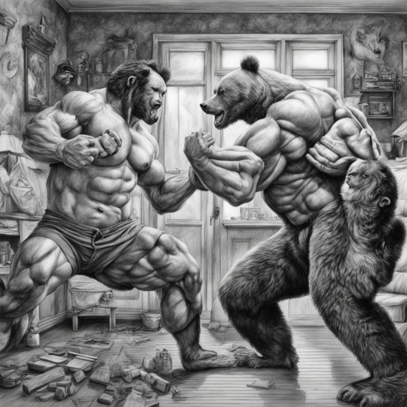 Големы синхронно двинулись на медведя, набычив лбы. Гризли махнул лапой, и один из клонов отлетел к противоположной стене, в щепки разнеся книжный шкаф. Он так и застыл там большой сломанной куклой. Второму голему удалось подойти ближе и обхватить медведя руками. Началось противостояние мышечных масс. Старец азартно потирал руки и громко подбадривал своего протеже.