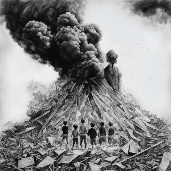 Вместо высоченного здания, что стояло здесь совсем недавно, грудилась огромная куча битого стекла, из центра которой как из жерла вулкана вился густой чёрный дым