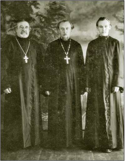 Город Осинники, 1957—1959 гг. Священник Александр Митрофанович Атапин (слева), священник Димитрий Алексеевич Вандзюк (в центре), диакон Павел Гаврилович Патрин