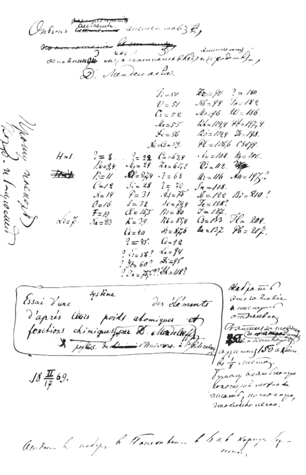 The manuscript of the table “The experience of the system of elements, based on their atomic weight and chemical resemblance.” February, 17 th of 1869