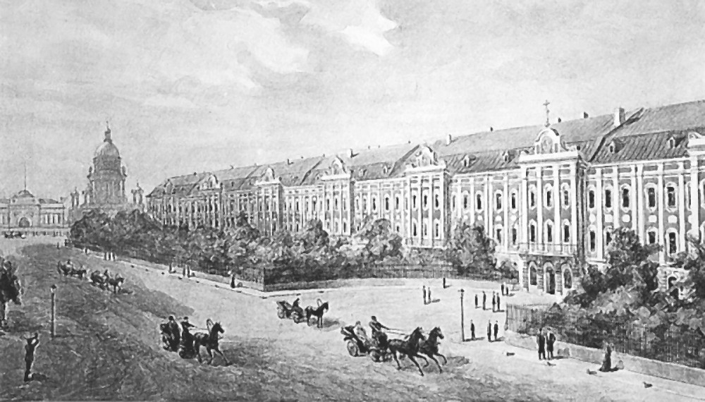 Saint-Petersburg University in the latter half of the 19th century. Water-colour by N. B. Belyavsky after the old engraving. Here D. I. Mendeleyev had been studying at the Main Pedagogical Institute (1850–1855), teaching (1857–1890) and living (1866–1890)