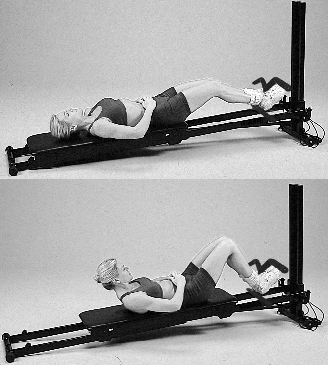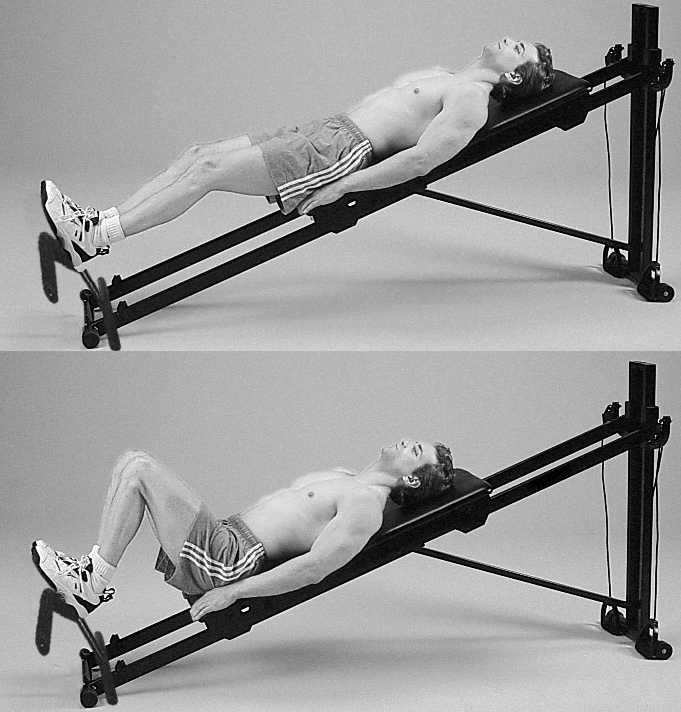 Хорошо зацепитесь ступнями за турник. Расположитесь на спине так, чтобы ягоицы были вблизи верхнего края доски. Сгибайте ноги до иех пор пока доска не упрется вам в пятки. Медленно разгибайте ноги. Повтор. Для задействования пресса при сгибании ног поднимайте голову и плечи. Не отрывайте спину от доски.