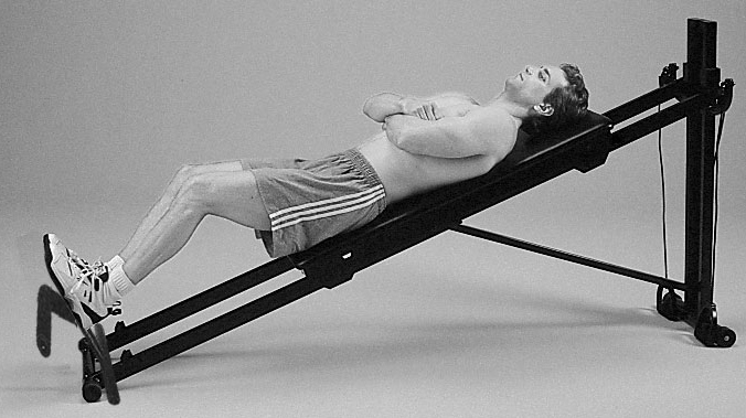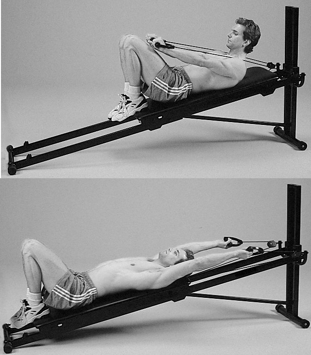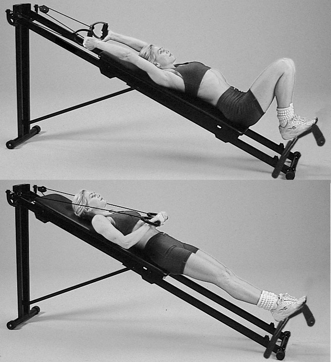 Ухватите ручки и лягте на спину так, чтобы голова была вверху доски. Вытяните руки над головой. Согните колени и расположите ступни на краю доски внизу. Двигайте руки по дуге вокруг груди пока они не коснутся бедра. Медленно верните руки в исходное положение. Повторите. Приподнимайте голову и плечи когда напрягаете руки (движение рук вниз) для задействования мышц пресса.