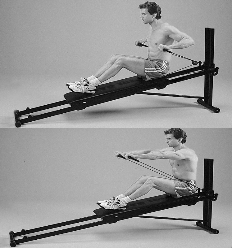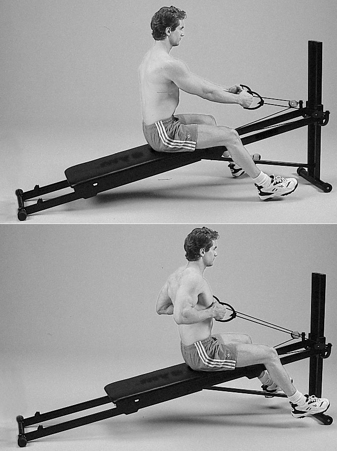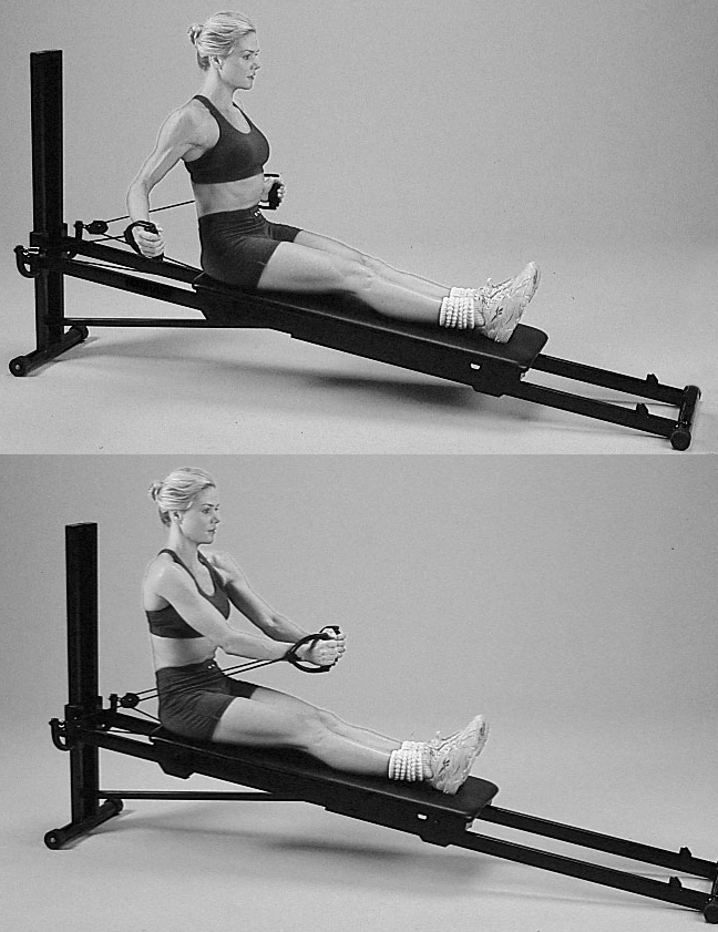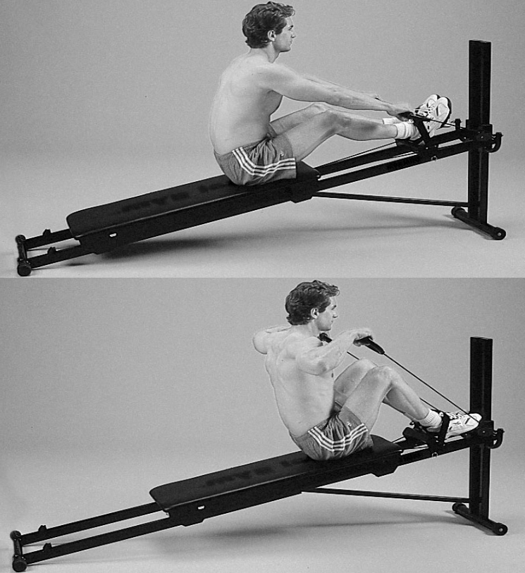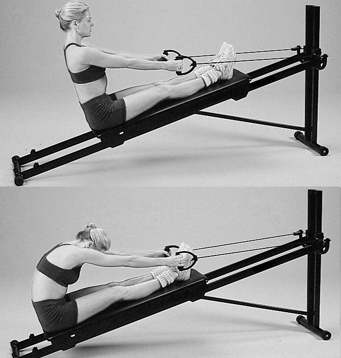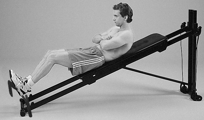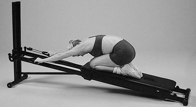 Ухватитесь за рукоятки. Подкатите доску вверх и сядьте на низ доски лицом к опорной колонне. Разместите ноги на доске. Распрямите руки и ноги. Медленно согнитесь в талии и тянитесь дальше. Оставайтесь в растянутом положении по меньшей мере 5 секунд. Распрямитесь для отдыха. Не сгибайте руки в локтях. Не дергайтесь. Повторите.