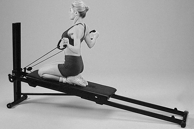 #10 Surfer: Подсоедините тяги. Ухватитесь за рукоятки. Расположите кулаки на верху доски. Станьте на колени лицом к опорной колоне. Колени должны касаться кулаков. Наклонитесь вперед протягивая руки вперед от себя. Тяните руки назад вдоль направляющих. Затем тяните тяните спину назад до прямого положения. Одновременно с этим продолжайте тянуть руки, слегка согнутые в локтях и разведенные в стороны до тех пор пока лопатки не соединятся. Вернитесь в исходное положение. Повторите.