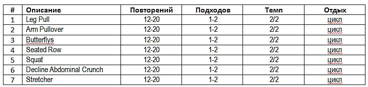 Стартовая программа должна быть использована при перерыве в занятиях больше 2-х недель. Упражнения №1 и №2 являются базовыми т.к. в них задействуются 80% основных групп мышц.