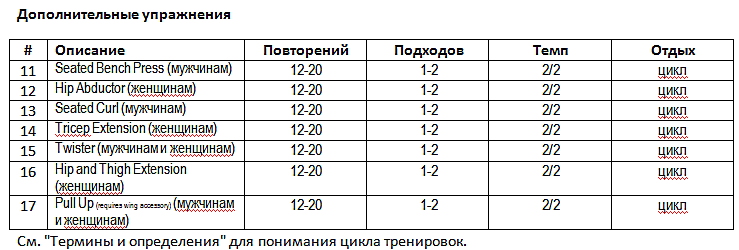 Циклы упражнений: Полноценные упражнения требуют регулярных систематических тренировок всех основных групп мышц. Полный фитнесс достигается циклами упражнений, т.е. сериями упражнений выполненными в определенной последовательности. После выполнения каждого упражнения и всего набора в целом повторите их согласно программе.