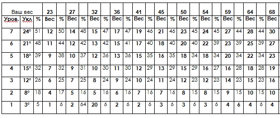 Total Gym® использует наклон доски для преобразования веса тела в нагрузку. Увеличивая наклон увеличиваете нагрузку. Используйте таблицу для определения нагрузки согласно ваше веса. При использовании тяг нагрузка буде еще вдвое меньше.