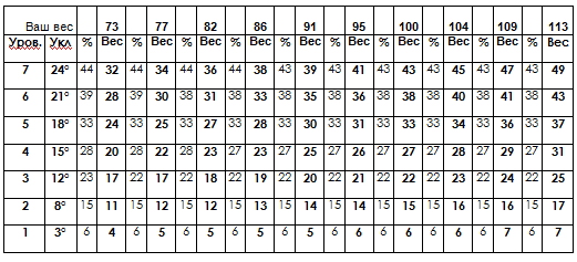 В Total Gym® используется наклонная плоскость с переменным углом наклона для создания сопротивления упражнениям путем изменения веса тела пользователя – чем круче угол, тем больше сопротивление. Просто умножьте массу тела пользователя на соответствующий процент, указанный в таблице.