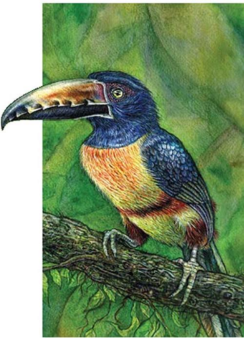 Из рода длиннохвостых туканов. Живут небольшими группами до 10 особей.