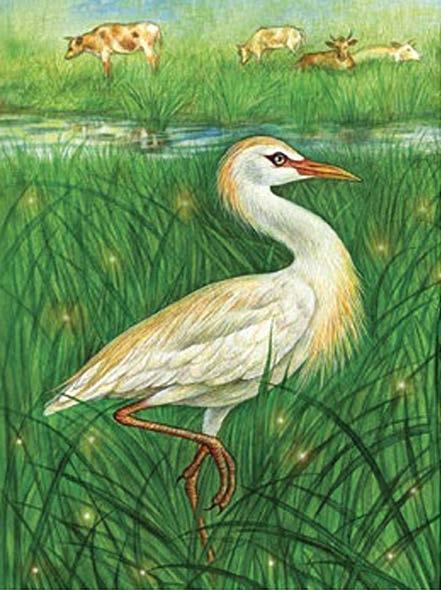 Самая сухопутная из всех цапель. Она отошла от околоводного образа жизни, поэтому у неё относительно короткая шея и короткий клюв, ведь пищу из-под воды доставать не надо. Охотится она очень своеобразно – сидит на спине у животных (слонов, зебр, гну, буйволов, носорогов, коров). Пасущиеся животные вспугивают насекомых, и цапля их поедает.