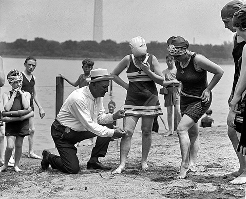 Реванш пуритан. Активист замеряет длину купальника на пляже в начале 1930-х годов