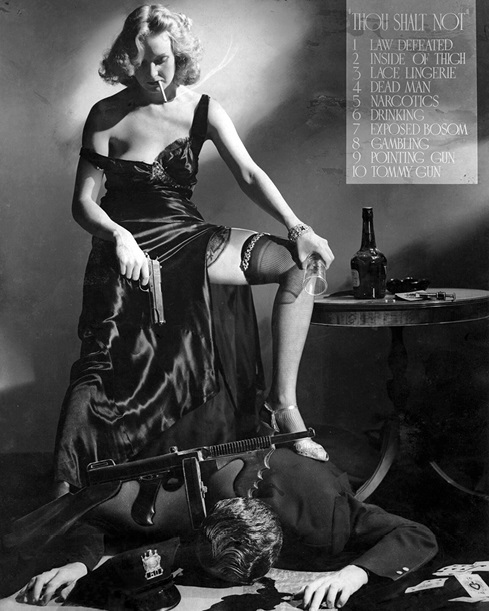 В этой пародийной фотографии 1940 года голливудский фотограф А. Л. Шейфер сумел показать сразу несколько запрещенных тем: внутреннюю часть бедра, кружевное белье, наркотики, алкоголь, азартные игры, попрание закона и др. 53