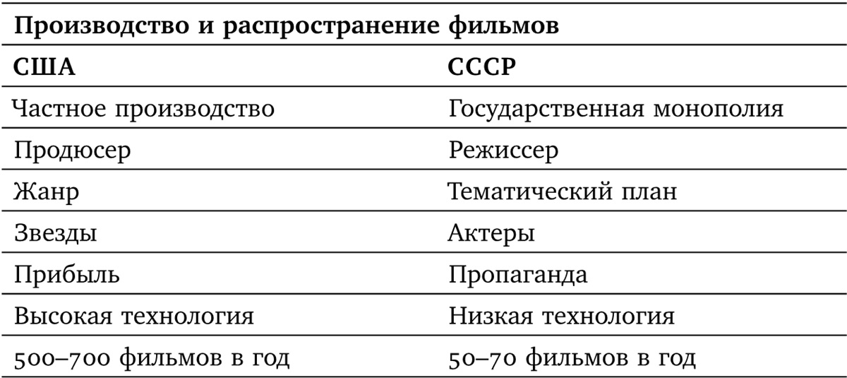 Что касается прибыли и пропаганды в этой таблице, то это, конечно, упрощение. Оба критерия были важны в обеих странах, но в разной степени. Красивый миф о том, что доходы от кино в бюджете СССР составляли третью по величине статью дохода после нефти и водки, давно развеян. При этом полного безразличия к доходности кинопроката тоже не было. Когда возникало противоречие между деньгами и идеологией, предпочтение отдавалось идеологии. Если законченные фильмы не успевали следовать за быстро меняющейся «линией партии», они запрещались, перемонтировались или даже уничтожались.