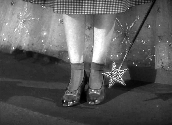 Сюжет в обоих фильмах связан с туфельками – хрустальными туфельками Золушки (как в сказке Перро) и рубиновыми туфельками (ruby slippers) Дороти. И у Баума, и у Волкова это были «серебряные башмачки» (silver shoes). Я подозреваю, что в фильме туфельки стали рубиновыми по настоянию художника – на фоне желтых кирпичей, по которым шагает Дороти, серебряные бы совсем не смотрелись.