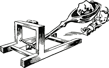 Едва только «ложку» отпускали, упругие канаты мгновенно раскручивались, поворачивая при этом «ложку». Верхний конец «ложки» быстро поднимался вверх и ударялся с большой силой о крепкую перекладину, – из ложки вылетал каменный снаряд. Сила толчка была так велика, что камень пролетал иногда несколько сот метров.